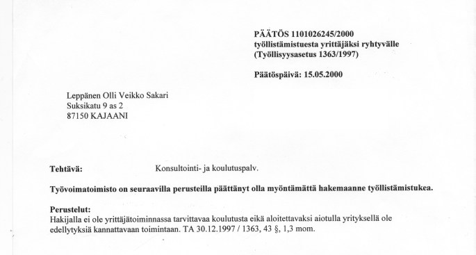 Julkaistu Koti-Kajaanissa 20.5.2015 Viisitoista vuotta sitten sain kotiini kirjeen, jossa kerrottiin starttirahahakemukseni tulleen hylätyksi. Perusteluna oli, että minulla ei ollut yrittäjäosaamista eikä yritykselläni edellytyksiä kannattavaan liiketoimintaan. Purin hampaani yhteen harmistuksissani ja siltä istumalta vein toiminimen rekisteröintipaperit maistraattiin. Oli pakko, sillä piti päästä lähettämään ensimmäinen lasku asiakkaalle. Onneksi olen saanut lähettää laskuja senkin jälkeen. Yksi ensimmäisistä … Jatka artikkeliin 15 oppia yrittäjyydestä
